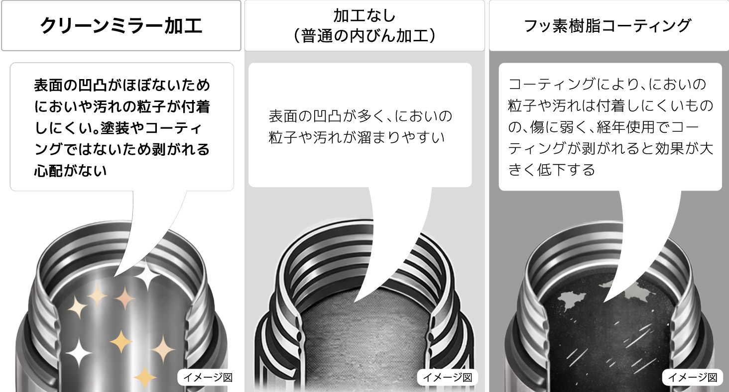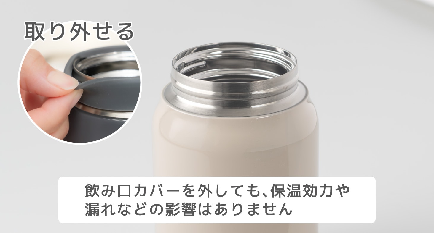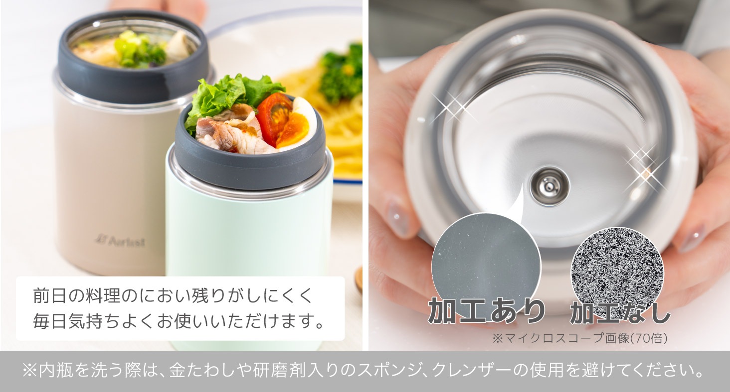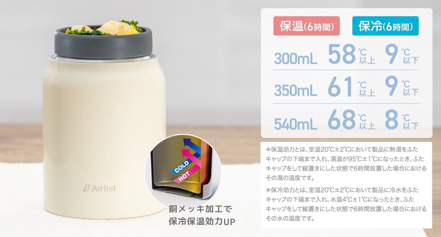 本製品は300mlサイズで本体重量が約185gと気軽に使える軽さに仕上げました。 内びんにはフッ素樹脂コーティングより、においが少ないクリーンミラー加工を施しました。 飲み口には口当たりの優しいシリコーン素材のカバーを採用。 ープなども注ぎやすい約50mmの広口です。は真空断熱二重構造と本体内びん外装設計への銅メッキ加工により、保温・保冷性能にも配慮しています。 スープやデザート、パスタなど、メニューに合わせて選びやすい3サイズ(300ml/350ml/540ml)からお選び頂け、充実のラインアップです。