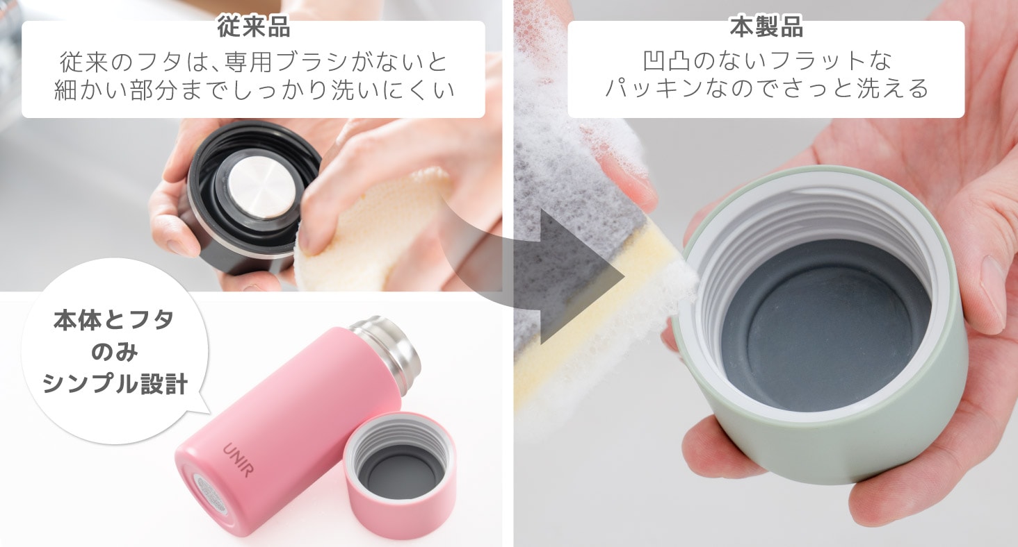 パッキン一体型で洗うたびにパッキンを付け外しする手間が省け、パッキンの紛失や付け忘れ、付け間違いといったトラブルも解消してくれます。