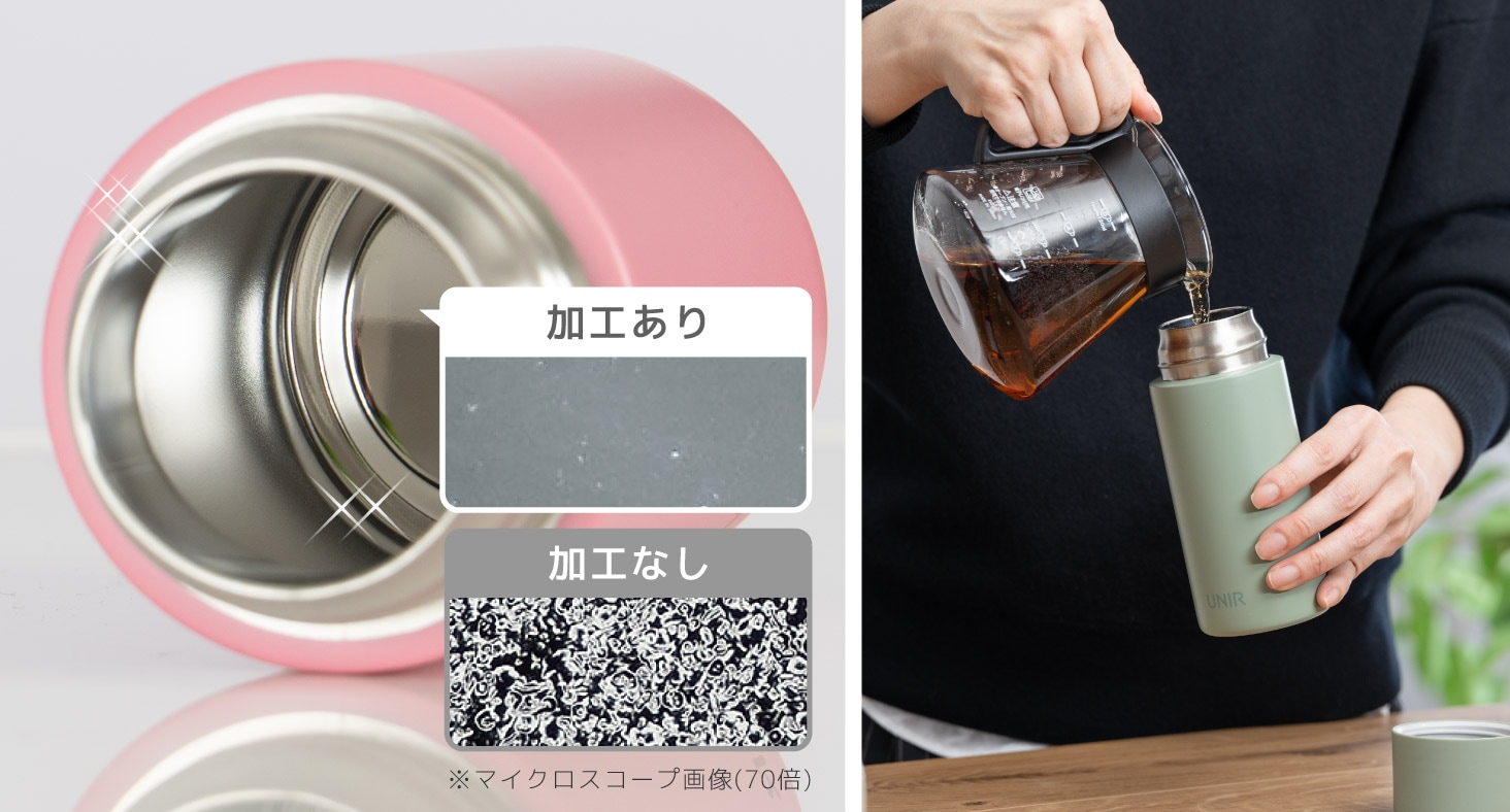 真空断熱構造+銅メッキ加工で保温・保冷効果が長持ち。