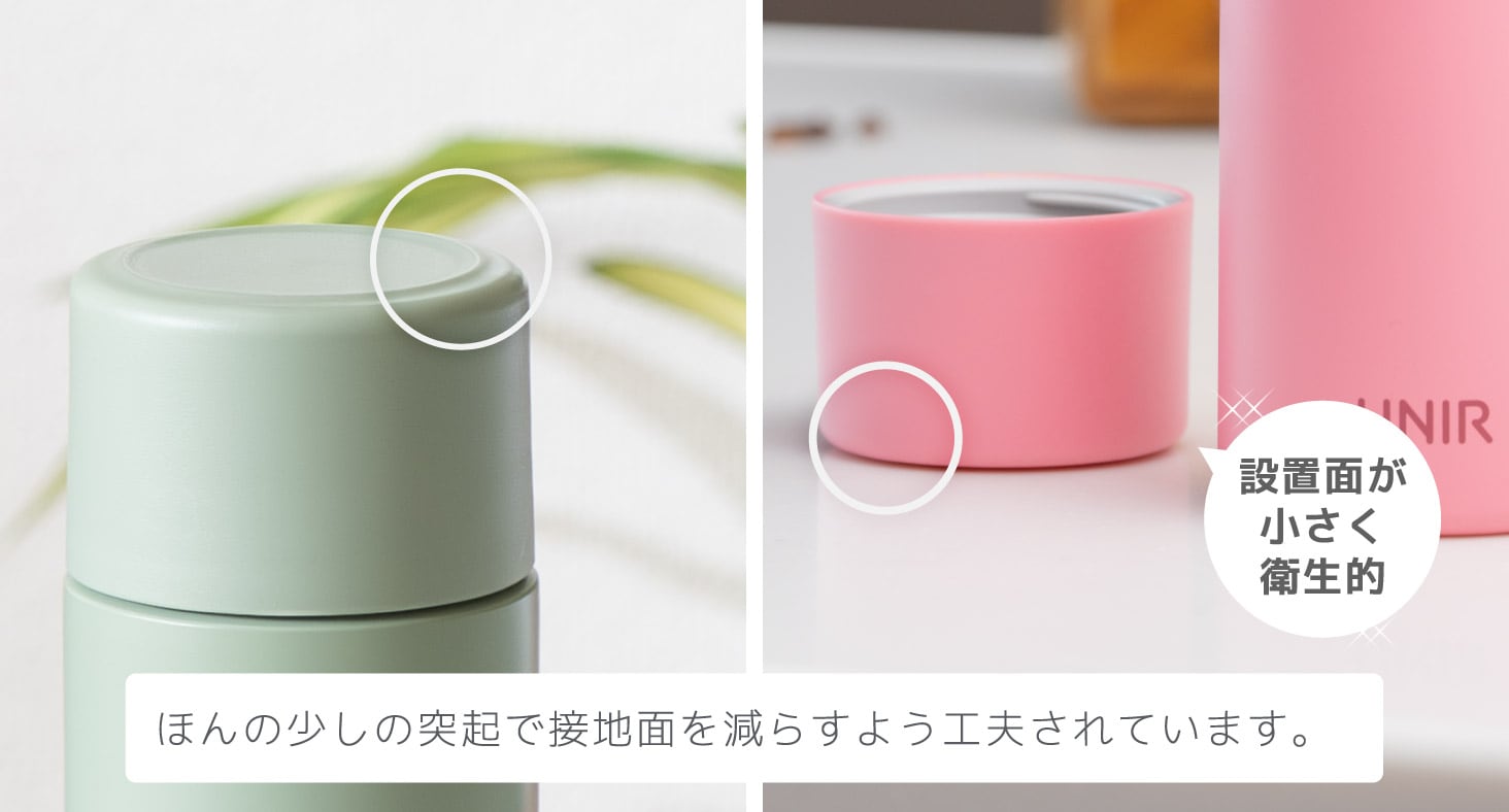 ふたキャップは抗菌素材を使用し、置いた時に接地面が小さい形状で衛生的。