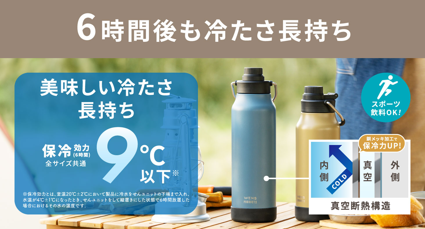 ※保冷効力とは、室温20℃±2℃において製品に冷水を口金の下端まで入れ、水温が4℃±1℃になったとき、キャップをして縦置きにした状態で6時間放置した場合におけるその水の温度です。