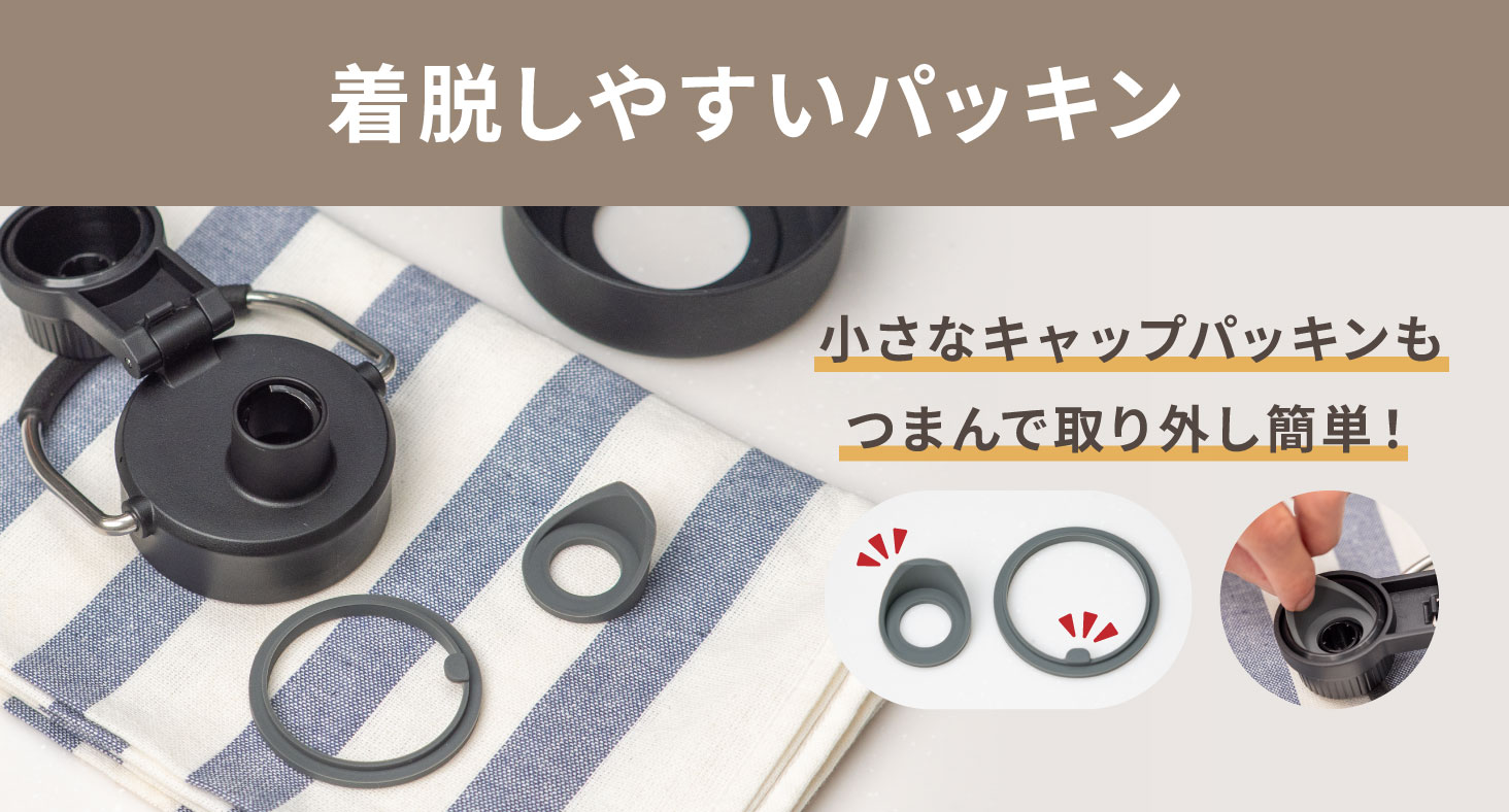 フタと一体型のキャップは紛失の心配がなく、開けた状態で固定できるため飲む際にも邪魔になりません。