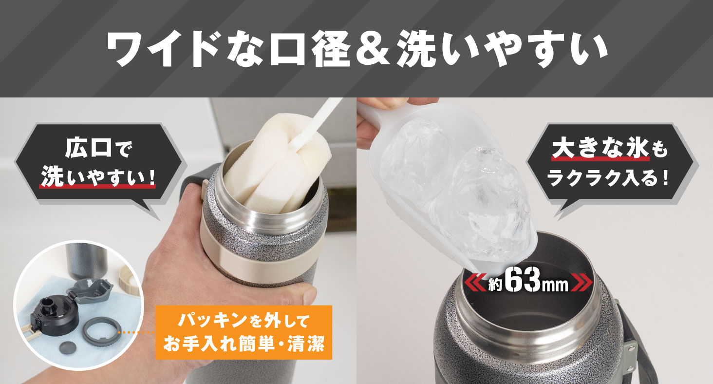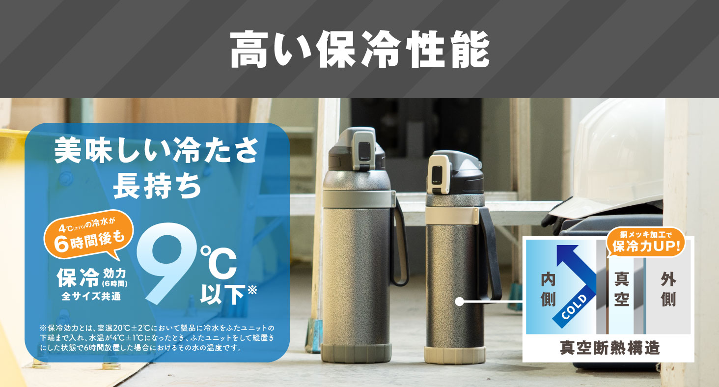 ※保冷効力とは、室温20℃±2℃において製品に冷水をせんユニットの下端まで入れ、水温が4℃±1℃になったとき、せんユニットをして縦置きにした状態で6時間放置した場合におけるその水の温度です。