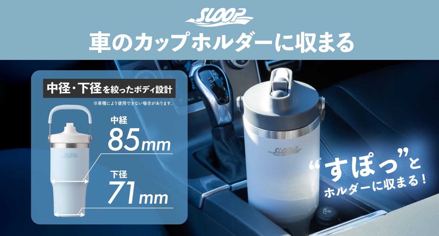 車中利用できるよう、本体下部と中央部の径を絞ることで一般的な車のカップホルダーにスッキリ収まる設計