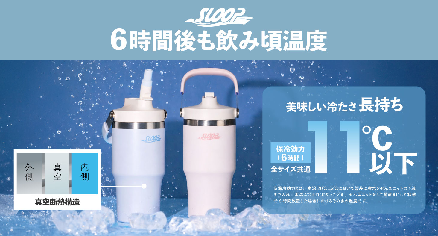 ※保冷効力とは、室温20℃±2℃において製品に冷水を口金の下端まで入れ、水温が4℃±1℃になったとき、キャップをして縦置きにした状態で6時間放置した場合におけるその水の温度です。